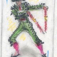 - En esta carta del naipe de espadas con el número 10 se representa enmarcado sobre un fondo blanco a un banderillero con dos banderillas, una en cada mano. Su traje de luces es de color verde.
