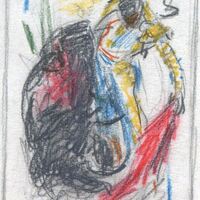 - En este dibujo que representa una carta de espadas y con el número 12 se ha dibujado una escena taurina en la que se puede apreciar la figura de un torero con su traje de luces azul y amarillo toreando a un toro negro herido por las banderillas.