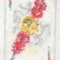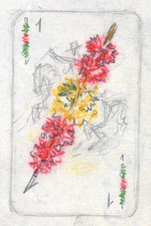 - Carta perteneciente a la baraja española, corresponde al as, el palo de la carta es lo que varía siendo una banderilla, debajo de la imagen a color se aprecia el dibujo a lápiz de una figura a caballo.