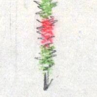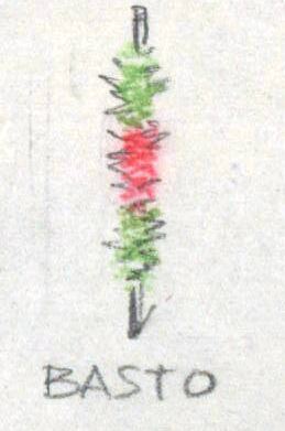 - Sobre un fondo blanco se ha representado en el centro la imagen de una banderilla en posición vertical de color verde y rosa. En la parte inferior se puede leer “basto”.