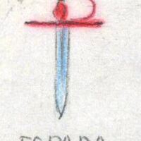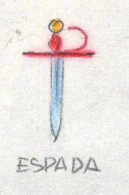 Bajo el lema de “espada” se ha dibujado una espada de filo azul y mango rojo, en una posición vertical.