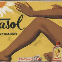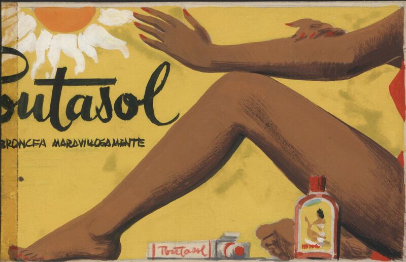 - A la izquierda de este cartel, donde en la esquina superior brilla un sol, se puede leer en letras negras y caligráficas la palabra “butasol” anunciando una crema de broncear. Sobre un fondo amarillo, a la derecha, se ven unas piernas femeninas muy morenas al igual que los brazos. A su lado está el bote de crema.