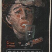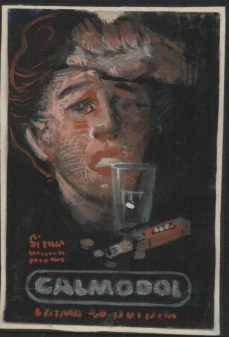 - En esta composición enmarcada y sobre un fondo negro se representa en el centro la imagen de una persona que hace un gesto de dolor llevando su mano sobre la frente. En la parte inferior se puede leer el lema “comodol” inscrito en un redondel ovalado y por debajo en letras rojas “calmará su dolor”.