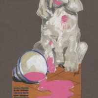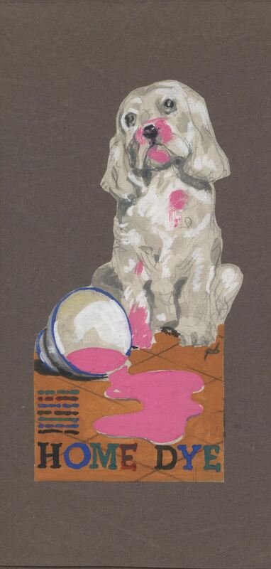 En este dibujo, cuyo fondo es oscuro, resalta en el medio de la composición la imagen de un perro blanco manchado de un líquido rosa. A su lado se puede ver una taza blanca y azul con un líquido rosa esparcido por el suelo amarillento y de superficie cuadriculada. El nombre que da título al dibujo, “home dye” está formado por letras de colores. Debajo de la figura del animal, a la izquierda, se vislumbra el boceto de la firma del pintor.