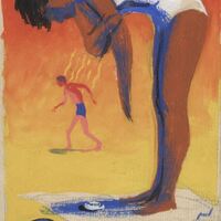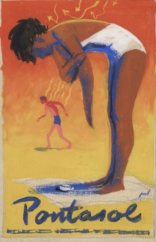 Bajo el título en letras azules de “pontasol” y en un fondo amarillo y rojo destacan en el dibujo dos figuras: en primer término, encima de una toalla blanca, una chica con traje de baño blanco se agacha mientras los rayos de sol le inciden en la espalda; en segundo término, un chico con traje de baño azul sobre el que también le inciden los rayos del sol. Sobre el título y a la izquierda se vislumbra el boceto de la firma del pintor.