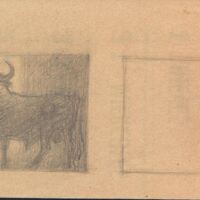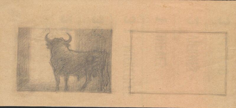 - Boceto publicitario con dos encuadres: en uno de ellos, un toro frente a un rectángulo claro que bien podría simbolizar la salida de chiqueros; el otro rectángulo está vacío, posiblemente en espera de la leyenda publicitaria.