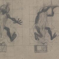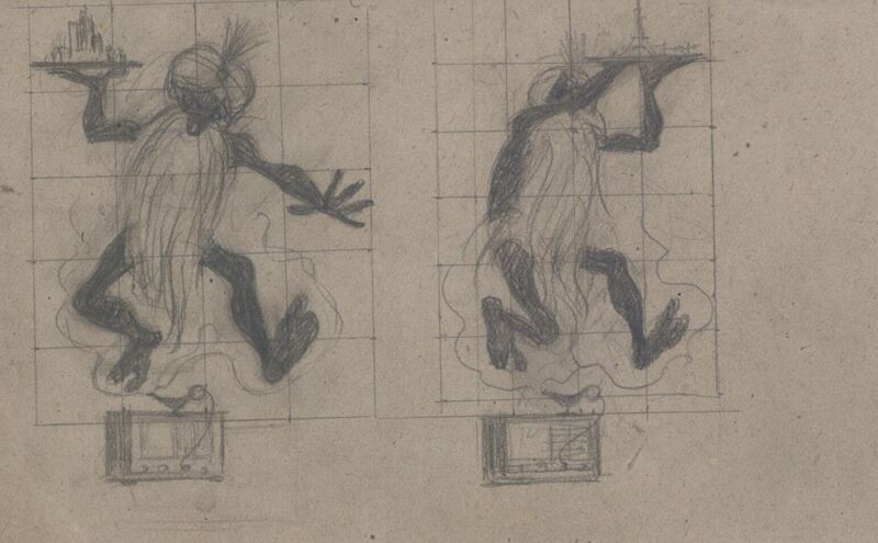 - Dibujo compuesto por dos bocetos sobre fondo cuadriculado, con dos imágenes de una radio conectada a una lámpara de donde sale la figura de un genio con forma de un mono caracterizado con una gran barba y turbante llevando en sus manos una bandeja.