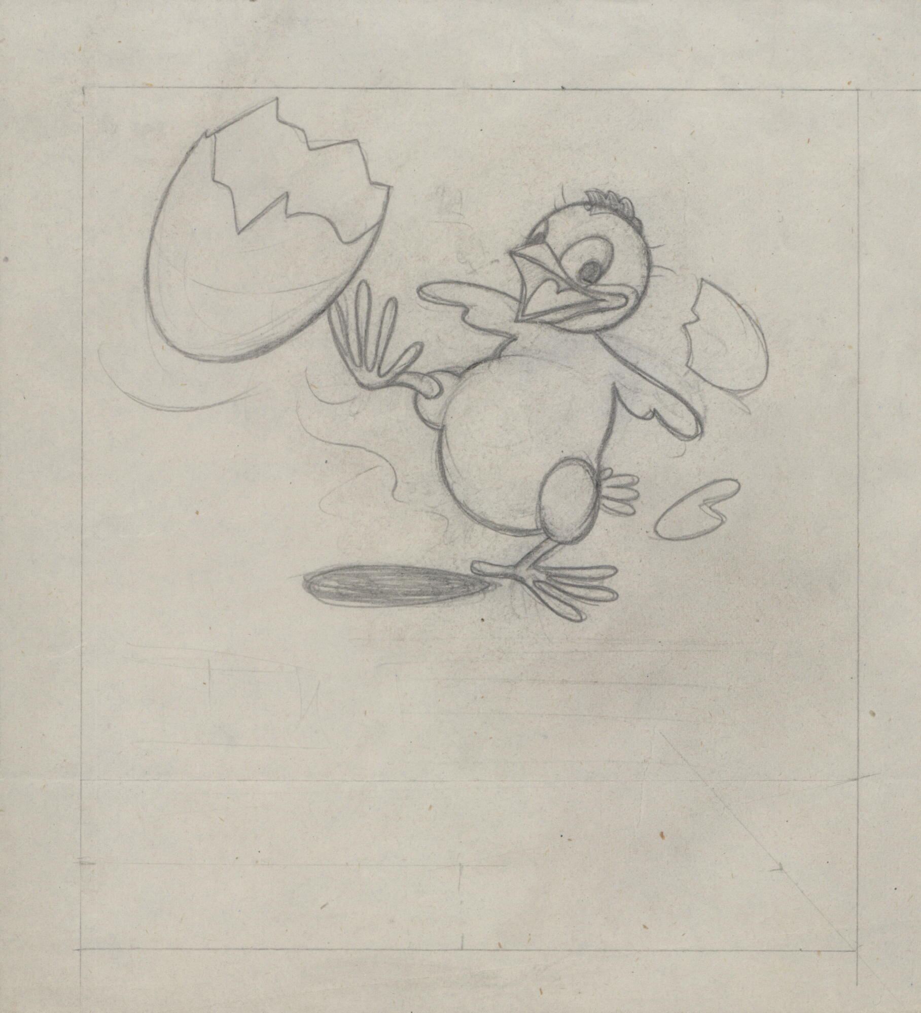 - Dibujo a lápiz de la imagen de un poyuelo feliz que ha salido del cascarón que aparece roto a su lado, y al que parece que está dando una estupenda patada. Toda la escena está enmarcada.
