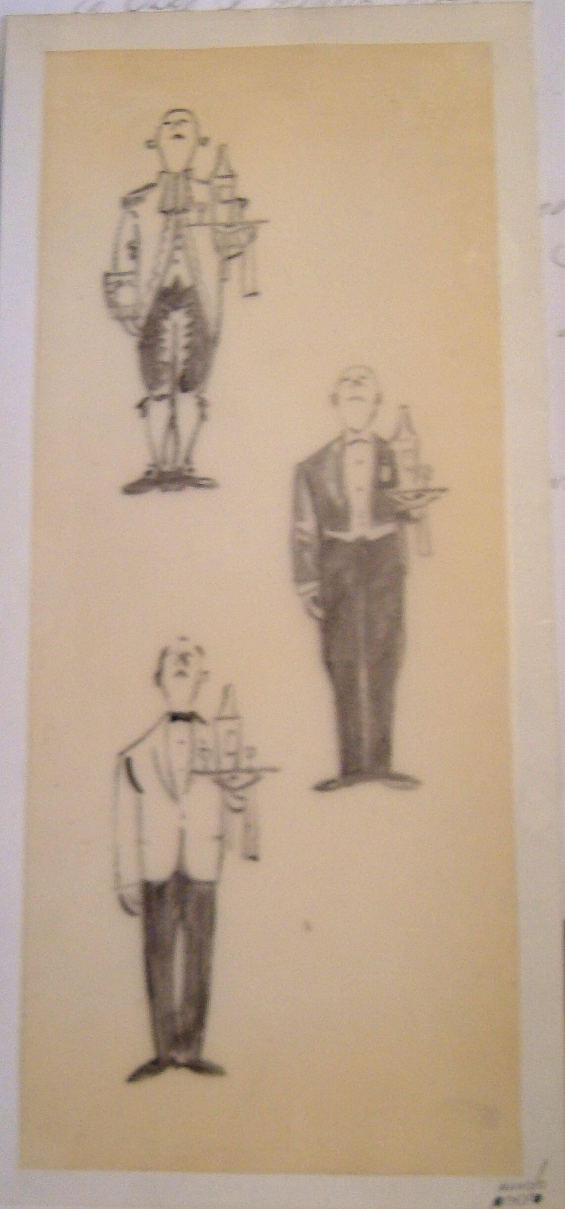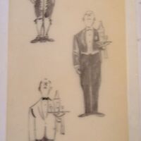 - Imagen de la figura de un camarero sosteniendo en su mano una bandeja con una botella y unas copas, representado con distintas vestimentas correspondientes a diferentes épocas hasta la actual.