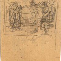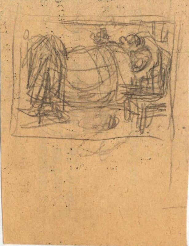 - En una disposición rectangular u en la parte superior ha dibujado el pintor la imagen, mediante líneas abocetadas, de alguien que duerme en una cama.
