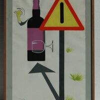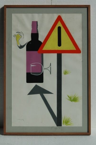 - Cartel Original.- primer plano una se ñal de trafico de Peligro indefinido que proyecta la sobra que es una flecha dirigida hacia una botella haciendo auto stop que como maleta lleva una copa, dibujado en el suelo unas hierbas.