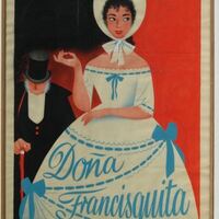 Cartel Original, representa a “Dña. Francisquita” vista de frente el la cabeza lleva un tocado en el escote se dibuja un lazo la izquierda esta doblada y la mano derecha se eleva hacia arriba y la mano en horizontal con dos dedos unidos. En el vestido dibujado de arriba a la derecha hacia a bajo a la izquierda y continuando a la derecha con unos lazos en los extremos la leyenda DÑA FRANCISQUITA, de tral de ella a la izquierda aparece un hombre mayor con barba , chistera y bastón. Por encima de el se lee la leyenda: LA CORRALA. La firma se encuentra en el cartel arriba a la derecha.