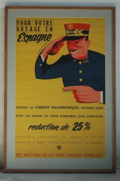 Cartel Inpreso.- Representa un empleado de Renfe saludando con la mano derecha y con la izquierda señalándole una dirección hacia la izquierda, la firma se encuentra al lado del puño blanco de la camisa de la mano izquierda. Leyenda: POUR VOTRE VOYAGE EN ESPAGNE –UTILISEZ DE CARNET KILOMTRIQUE VALABLE DANS TOUS LE TRAINS ET POUR N`IMPORTE QUEL PARCOURS-RECUTON 25%-DEMANDEZ LE SANZ TARDEN AUX AGENCER PAR LE RESEAU NATIONAL DEC CHEMINS DE FER ESPAGNOLS- RED NACIONAL DE LOS FERROCARRILES ESPAÑOLES