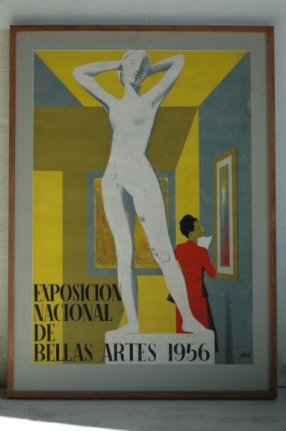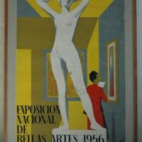 - Representa en primer término una escultura de mujer desnuda con los brazos por detrás de la cabeza, en segundo término una mujer vestida de rojo viendo la exposición y tomando notas detrás al fondo aparece un marco y en el lado derecho donde la mujer se para a observarlo otro. La firma se encuentra enclavada al lado derecho abajo en negro. Leyenda: EXPOSICION NACIONAL DE BELLAS ARTES 1956