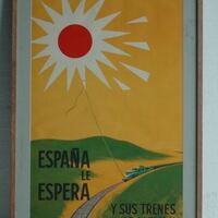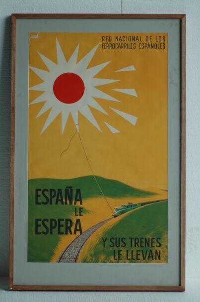 - Carte Impreso.- Aparece a la izquierda arriba un sol que de uno de sus brazos lleva una guita amarrada a u n tren que viene por la parte baja del cartel entre un paisaje , se observa que las vías están dibujadas. La firma se encuentra arriba a la izquierda. Leyenda arriba a la derecha “FERROCARRILES ESPAÑOLES” hacia la mitad a la izquierda “ESPAÑA LE ESPERA”, y a bajo a la derecha “ Y SUS TRENES LE LLEVAN.