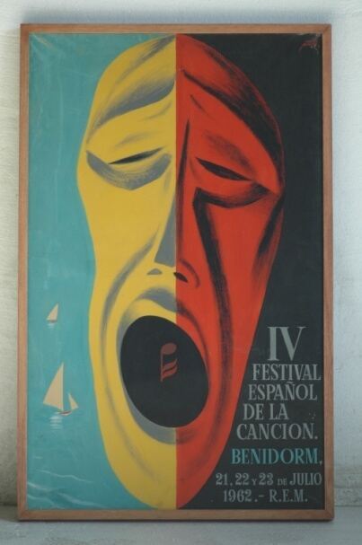 - Cartel Original.- Representa una cara pintada a dos colores cantando y del interior de la boca sale una letra musical , a la izquierda del cartel representa el mar hay dos barquitos de vela al lado derecho pintado de negro aparece la leyenda: IV FESTIVAL ESPAÑOL DE LA CANCION-BENIDORM-21.22.23 DE JULIO 1962.