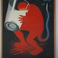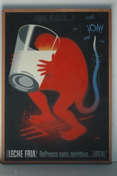- Figura principal “ El Diablo bebiendo un vaso gigante de leche que de la sensación de fría se le está enfriando el rabo, con cinco aclamaciones de ¡oh! Y arriba la leyenda “ Que placer” abajo del cartel “LECHE FRIA REFRESCANTE NUTRITIVA …¡IDEAL! MEDIDAS: 103 x 72,5 cm.