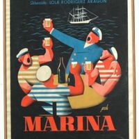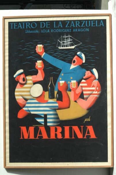 - Cartel Original.- representa a tres marineros y un capitán, por la indumentaria, alzando unos vasos de vino, todos ellos sentados en una mesa redonda con dos botellas de vino, la firma está situada al lado de la mesa en la derecha del cartel. Leyenda MARINA. Abajo del cartel. Arriba del cartel leyenda: TEATRO DE LA ZARZUELA Dirección: LOLA RODRIGUEZ ARAGON. Debajo de la leyenda aparece un barco9 dibujado en el mar.