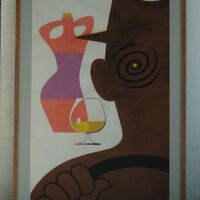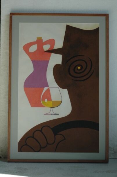 - Cartel original.- En primer término aparece la silueta de un conductor con sombrero y su ojo derecho representado por una espiral está mirando a una botella que se le figura a una chica con una copa, tentándole para que beba