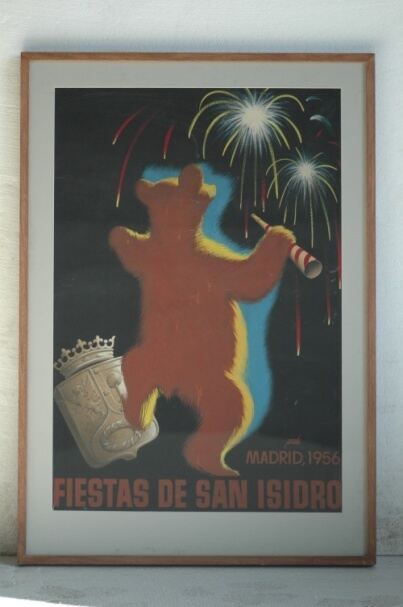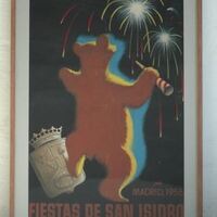 - Representa al Oso del madroño divirtiéndose, se encuentra de espaldas y un poco de perfil , la pata izquierda se apoya en el escudo del ayuntamiento en la mano derecha tiene una trompetilla y al fondo hay unos fuegos artificiales. La firma esta en la parte baja del cartel entre la pierna derecha del oso. Leyenda: MADRID 1956- FIESTAS DE SAN ISIDRO