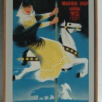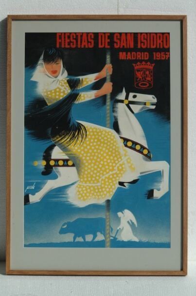 - Carel Original.- Representa a una chulapa montada en los caballitos la figura esta de perfil y la cara mirando al frente agarrada con las manos a la barra del caballo al fondo se ve un buey con un ángel arando la firma está al lado de la pezuña del caballo al lado derecho, la mujer lleva traje de chulapa,pañuelo en la cabeza y un mantón sobre la espalda. La leyenda FIESTAS DE SAN ISIDRO MADRID 1957 Y DEBAJO EL ESCUDO DE MADRID