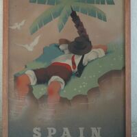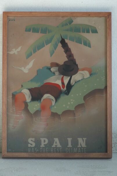 - Cartel Original.- Representa a un obre descansando en toda la península Ibérica, la cabeza esta a la sombre de una palmera , un sombrero tapándole la cara a su izquierda volando dos palomas y los pies refrescándose en el mar. Leyenda: SPAIN – HAS.THE BEST CLIMATE.