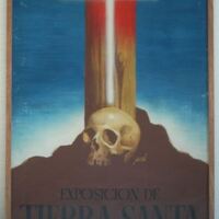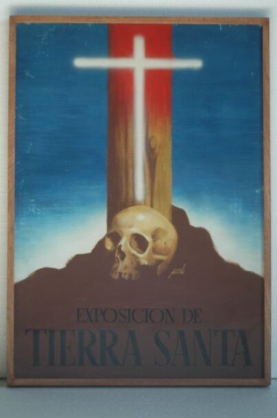 - Cartel que en primer término aparece una calavera en el centro del cartel tirada en un montículo de tierra que detrás de ellos aparece un poste de madera clavado en ese montículo y encima de la calavera sale una cruz pintada en blanco. Leyenda: “EXPOSICION DE TIERRA SANTA.-