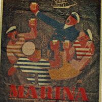 - Cartel del teatro de la Zarzuela sobre una obra la Marina, con la imagen de capitán y tres marineros de compadreo, cantando y alzando las copas que llevan en la mano como si verdaderos piratas se tratase.