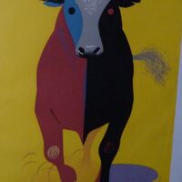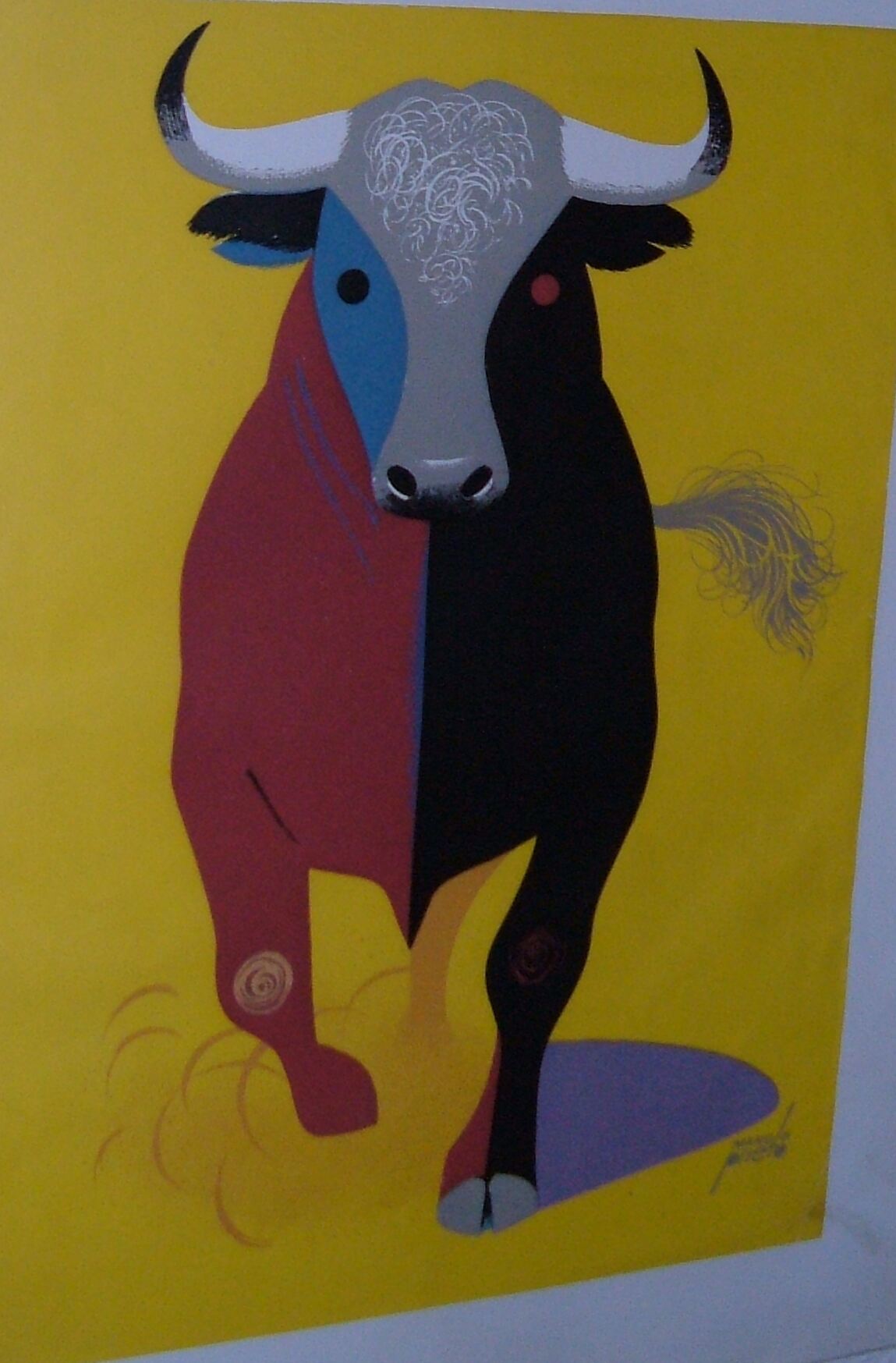 Sobre un fondo albero, la figura de un toro de frente al espectador, con colores que marcan la fisonomía del toro deforma geométrica y plana. Es uno de los carteles, acaso, más repetidos de Prieto: la imagen totémica del toro explica su éxito y su abundante difusión en carteles o estampas.1er. Premio del concurso para la Corrida de la Beneficencia.