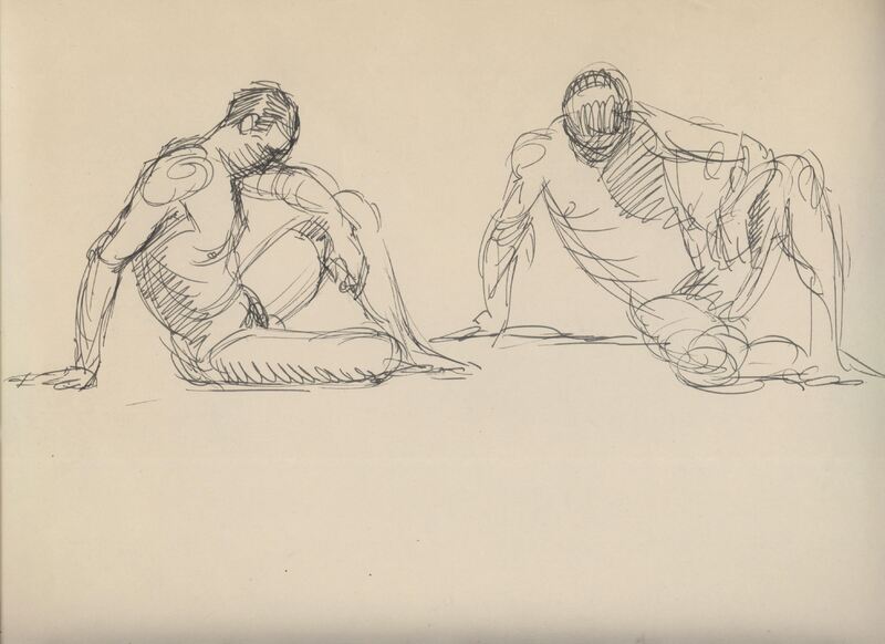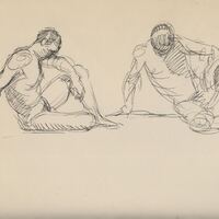 - Apunte a lápiz, de un hombre desnudo sentado, apoyando una mano sobre el suelo y el otro brazo apoyado sobre la rodilla, con la cabeza inclinada hacia abajo con aptitud de reflexión, en este apunte se aprecia la misma figura vista lateralmente y de frente.