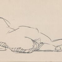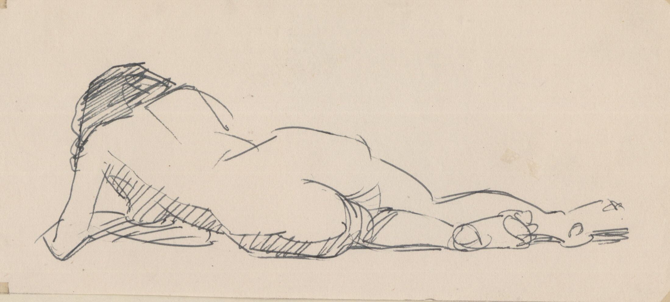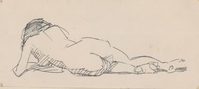 - Apunte de una mujer desnuda de espaldas, recostada sobre uno de sus brazos. La utilización de líneas tan precisas le da cierto encanto geométrico a este esbozo, que recuerda a la serie de desnudo que Joaquín Sorolla desarrolló a partir de la Venus del espejo de Velásquez.