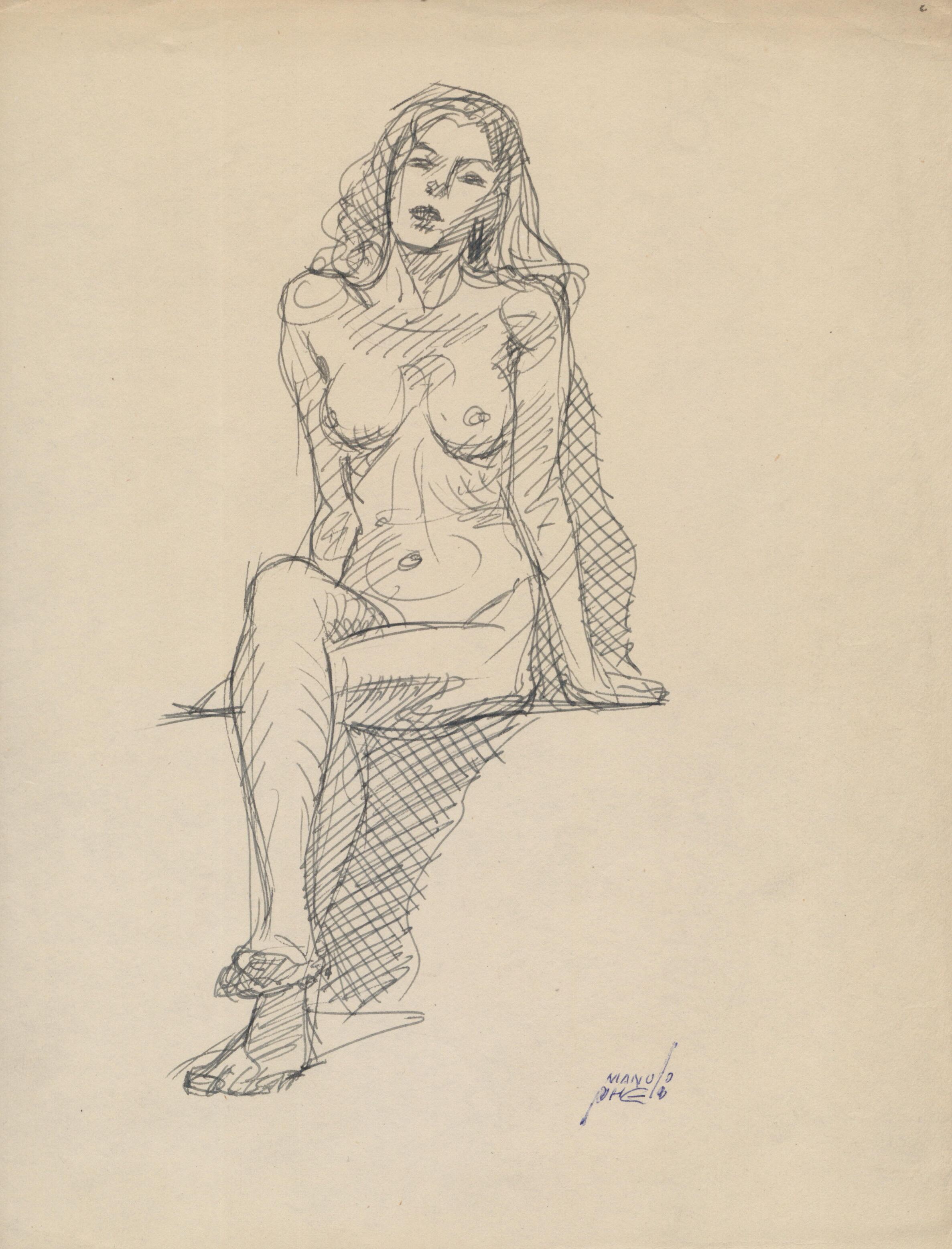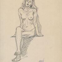 - Apunte de un desnudo de mujer, vista de frente sentada con las piernas cruzadas e inclinándose un poco hacia detrás debido a la posición de sus manos. El dibujo nos resulta de alguna manera más explícito, acaso por la personificación más concreta del rostro de la modelo en este caso.