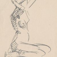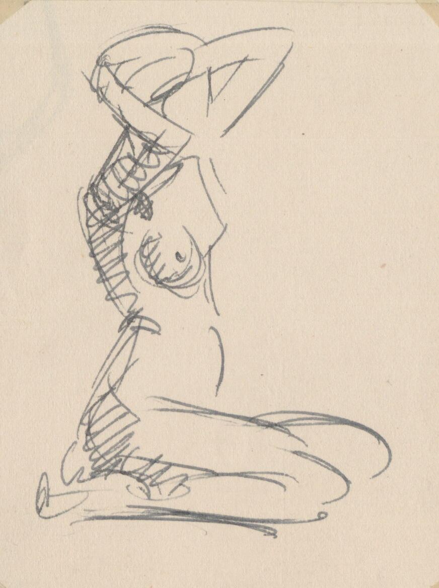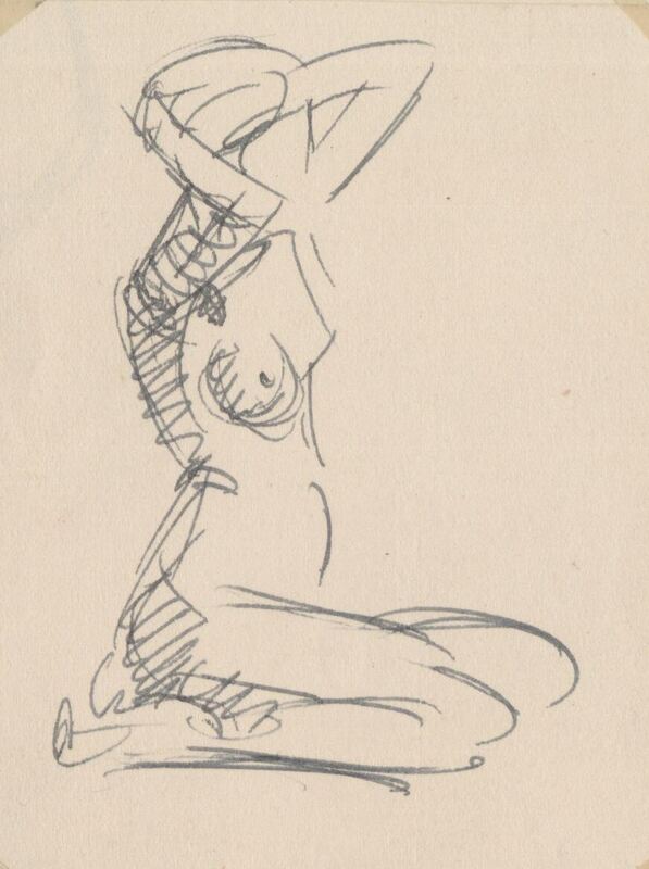 - Precioso dibujo de una mujer vista de perfil, sentada sobre sus rodillas con sus manos en la cabeza como si se recogiese el pelo. Apenas una líneas de contorno y de sombreado bastan para crear el ambiente, o el gesto, envolvente de una escena íntima y sensual.