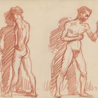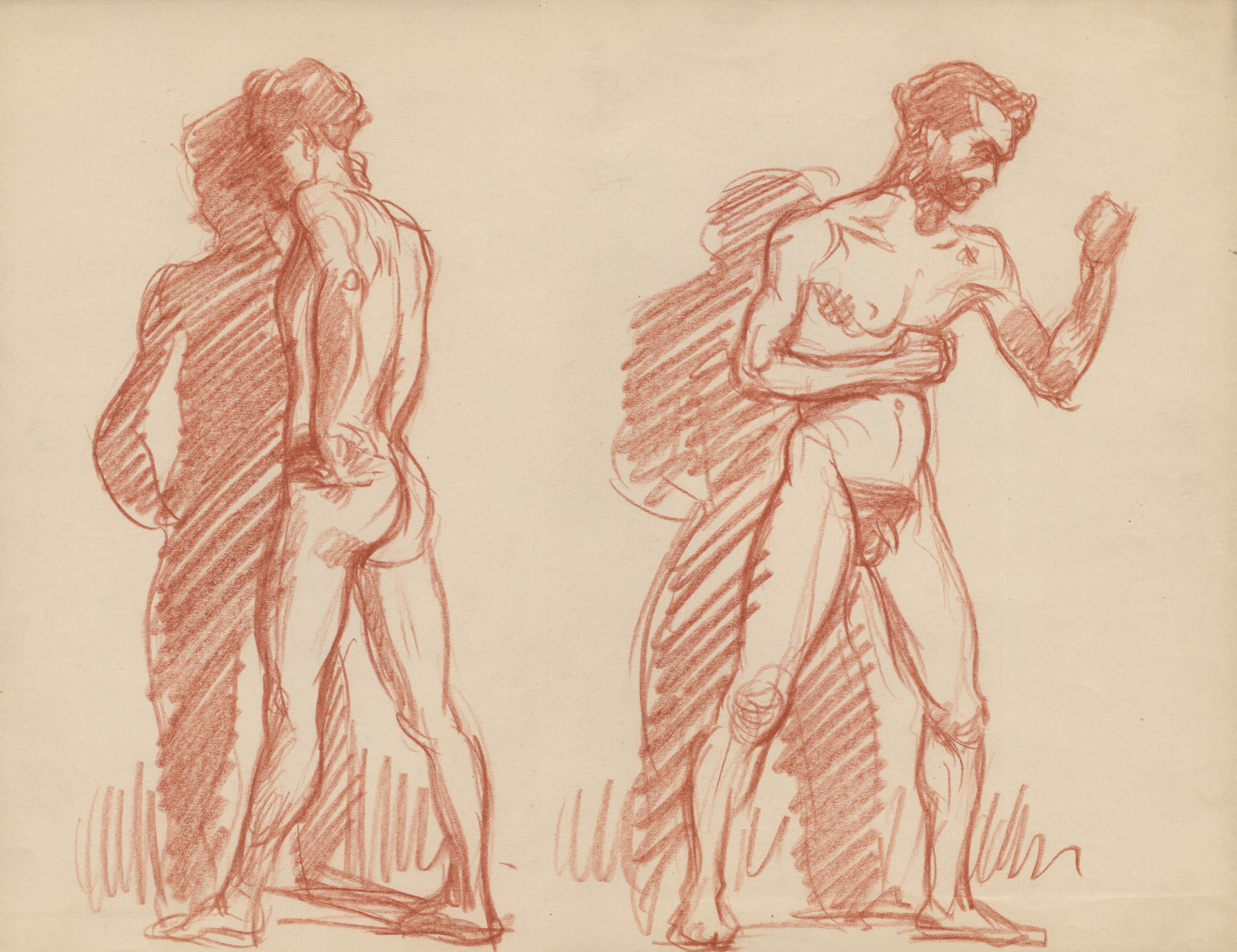 - Apunte a sanguina del desnudo de un hombre en diferentes posiciones, la primera figura de espaldas de pie, y la segunda figura un hombre de frente en aptitud de lucha. La forma del pelo nos induce a pensar de que se trata, en los casos, del mismo personaje, quizá un modelo profesional.