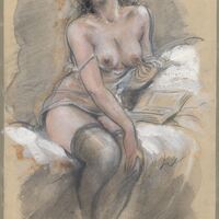 - Ocupando toda la escena, la figura de una mujer sensualmente semi-desnuda, sentada sobre la cama con aptitud sensual, utilizando la combinación de lápiz y color: además el color negro y el blanco, con su abrupto contraste, no hacen más que realzar la febril palidez anacarada de la dama.