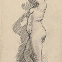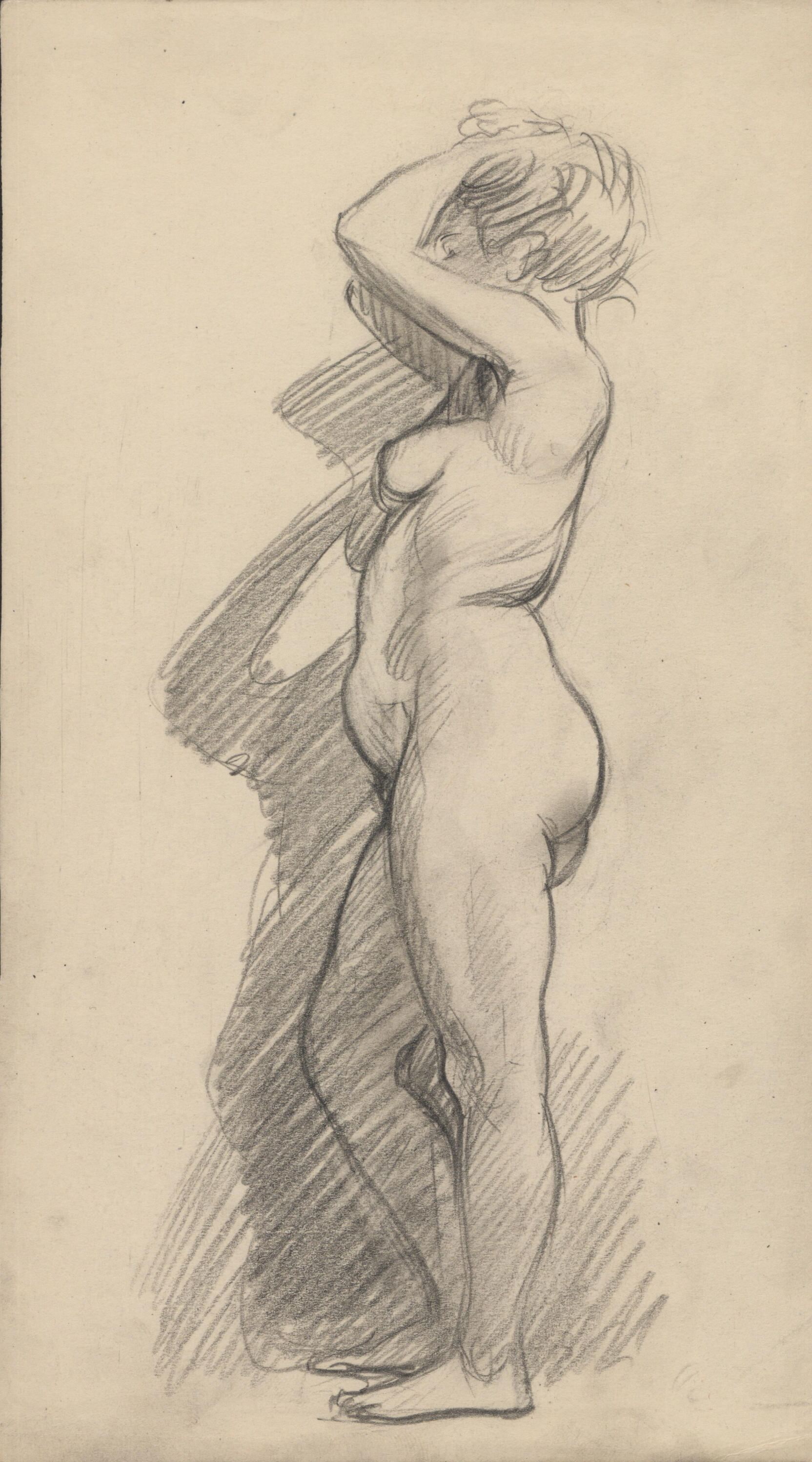 - Apunte del desnudo de una mujer de perfil, recogiéndose el pelo con las dos manos. Una vez más el mismo esquema que otras veces, pero con un acabado de mayor calidad y precisión. El sombreado de la pared del fondo ha servido también para sombrear la pierna derecha de la modelo.