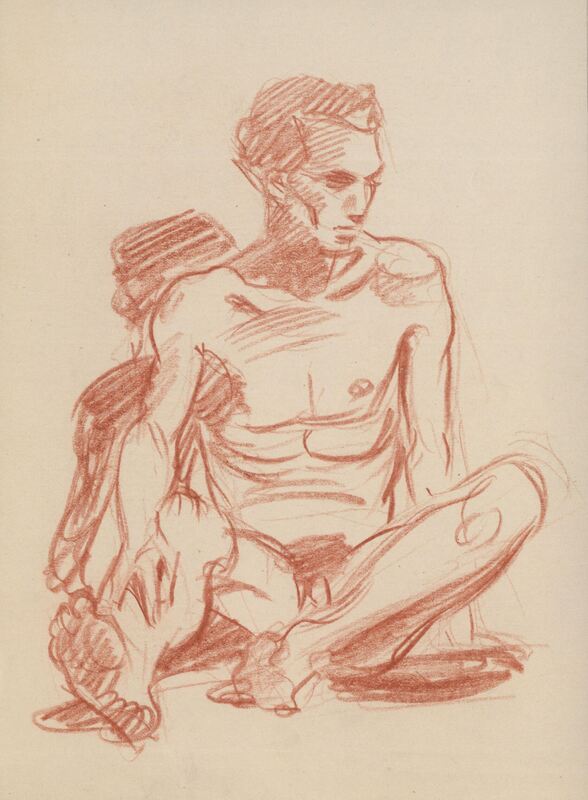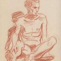 - Apunte del desnudo de un hombre de frente al espectador, sentado con uno de sus brazos sobre una de las piernas semiestiradas. Recuerda –sin que ello sirva a posibles interpretaciones más allá de un simple parecido superficial- a los bocetos del Viejo al sol de Fortuny.