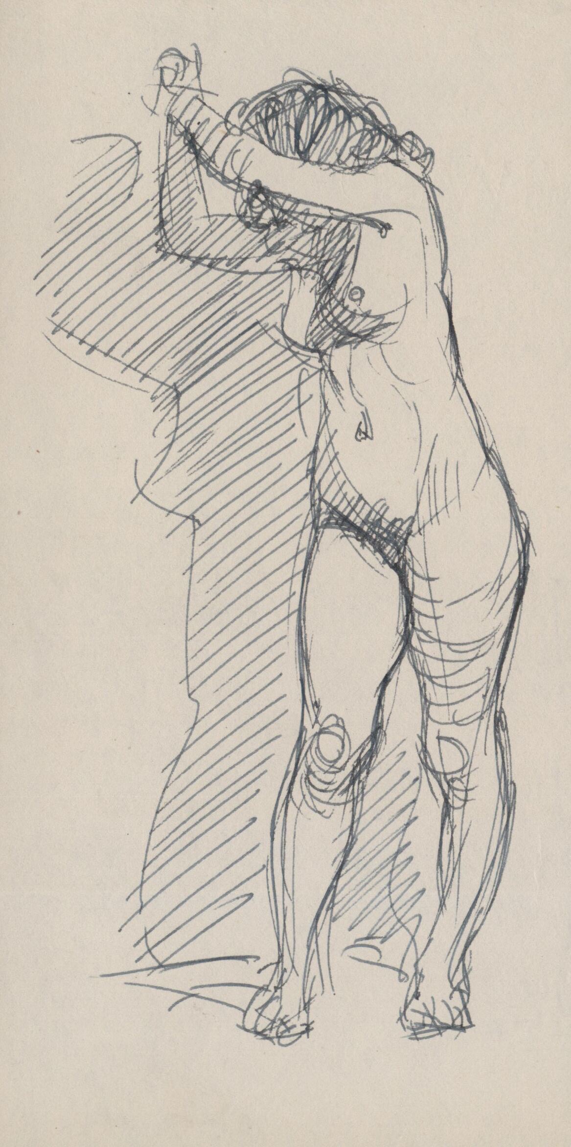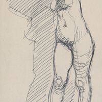 Apunte del desnudo de una mujer de frente al espectador. La extraña postura de la joven se debe, no a que esté haciendo el amago de golpear en algún objeto, sino a que se está apoyando con las dos manos en una de las cuerdas utilizadas en los estudios de dibujo para facilitar el aguante de los modelos en posturas más complicadas mientras los estudiantes los dibujan.