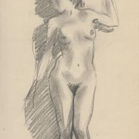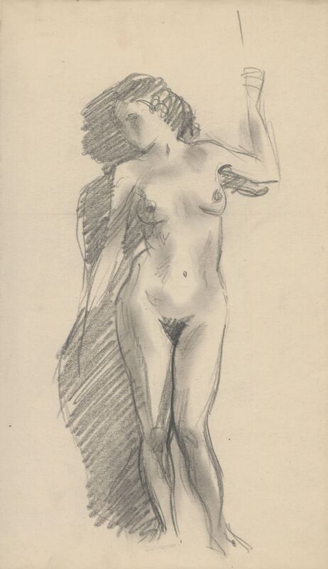 - Dibujo de una mujer desnuda de frente al espectador, apoyada sobre una pared con el brazo alzado y apoyado ella, con la sombra –sin ningún tipo de matización, ni esfumato a diferencia del cuerpo- proyectada sobre pared. La mano en alto es sujetado por una cuerda, que es un recurso típico de la escuelas de dibujo.