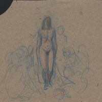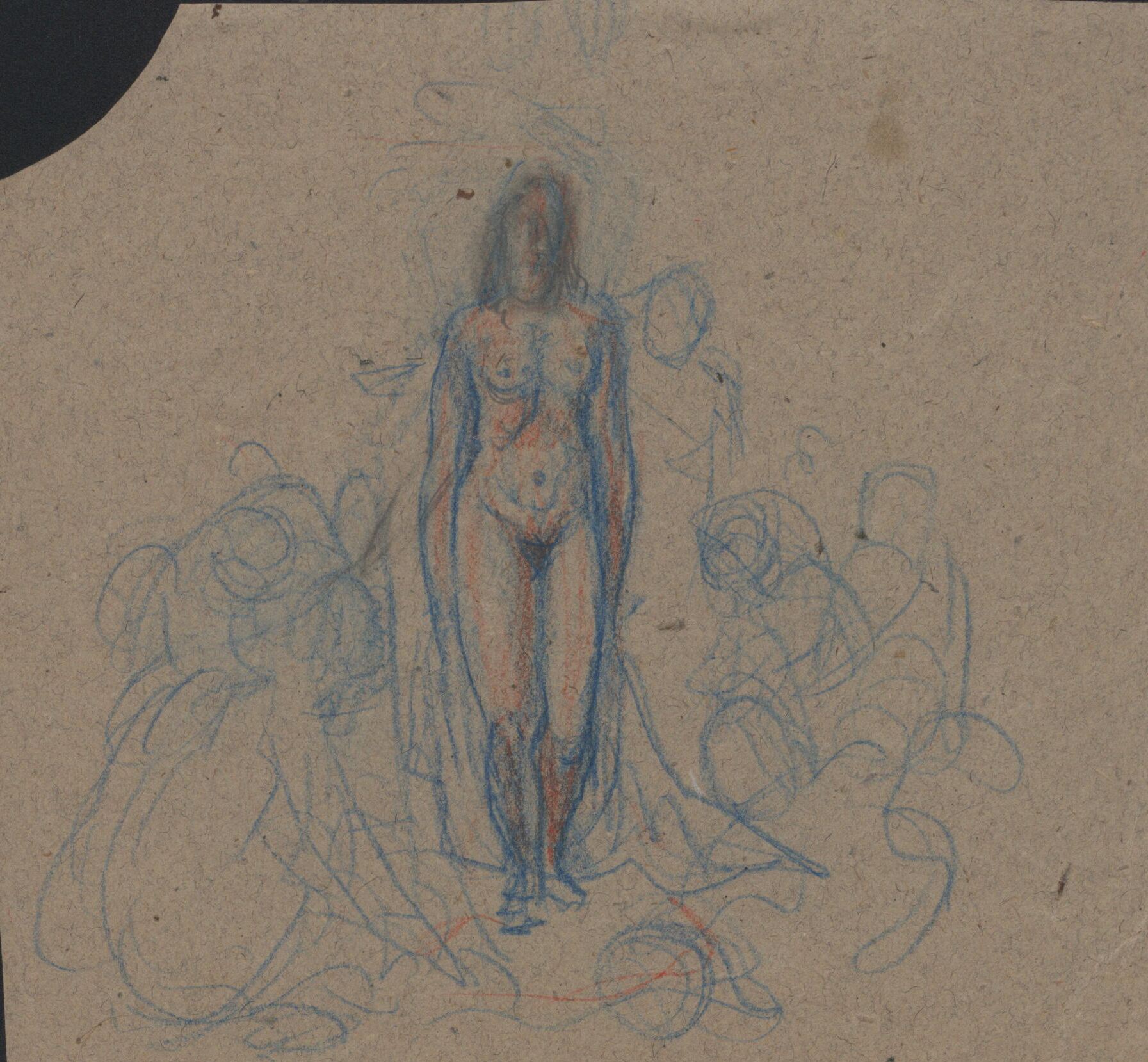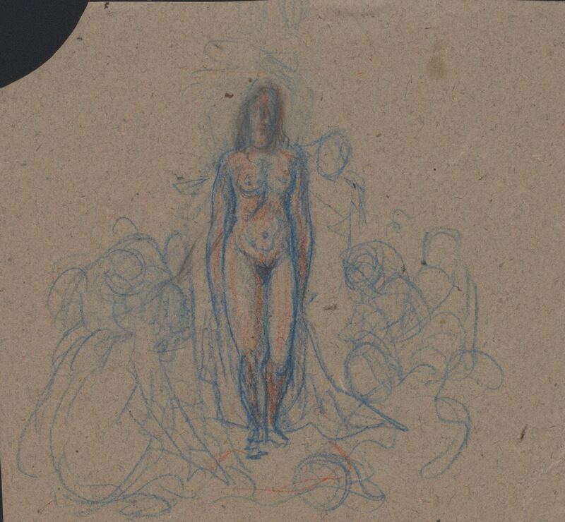 - Una figura femenina desnuda ocupando el centro de la escena, en tonos azules y toques de color rojo. En torno a ella las siluetas, apenas insinuadas, de otras mujeres. El tono azul, la matizaciones rojas, lo incomprensibles de las figuras que rodean a la principal, datan al dibujo de un misterio que, vagamente, hemos querido seguir manteniendo con el título.