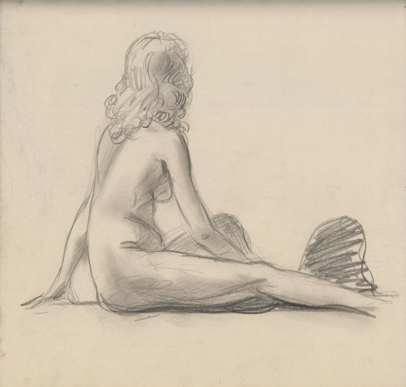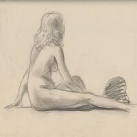 - Dibujo a lápiz muy trabajado, donde se aprecia a una mujer desnuda de espaldas al espectador con una melena que le cae sobre sus hombros, apareciendo una mano apoyada en el suelo que levanta parte del cuerpo y sus piernas extendidas sobre el suelo.