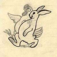 - Bajo un fondo amarillento se destacan dos figuras de perfil, una al lado de la otra. Son un conejo y una gallina. Ambas figuras adelantan una de sus piernas en actitud caminante y ambas sonríen. Predominan las líneas de color negro y gris.