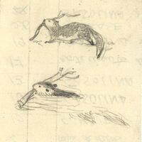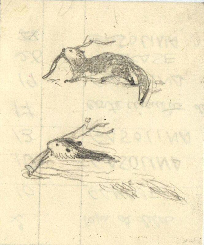 - Dos figuras representan a dos castores: en la parte superior, ya en tierra con su rama en la boca y, en la parte inferior a otro en el agua, también con una rama en la boca. Destacan los colores oscuros sobre un fondo amarillento.