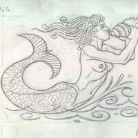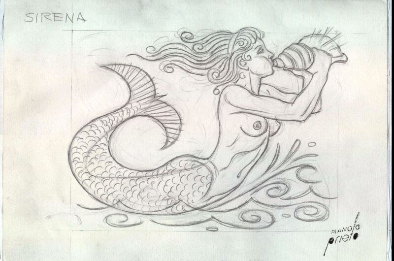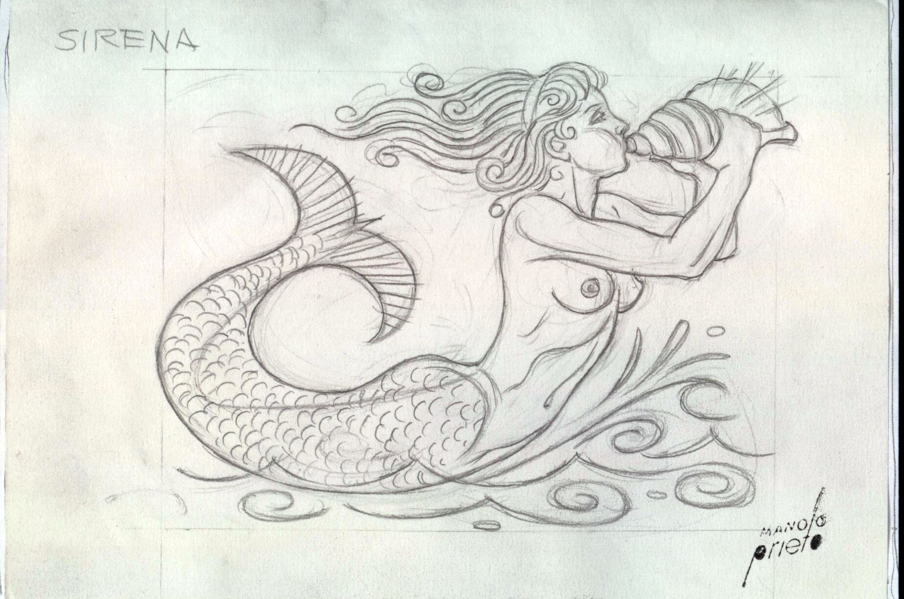 - Sobre un fondo gris se ha dibujado a una sirena con los cabellos sueltos, de perfil, sobre las aguas y llevando una concha a su boca como si fuese un cuerno de llamada. El dibujo está firmado en la parte inferior de la izquierda.
