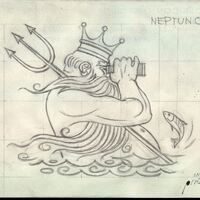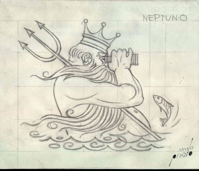 - En este dibujo donde destacan los tonos grisáceos se ve la figura de Neptuno con su tridente cogido por un brazo y una corona sobre su cabeza, en posición de perfil saliendo de las aguas del mar mirando por un catalejo. En el fondo se aprecia una superficie ligeramente cuadriculada.