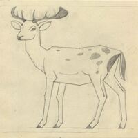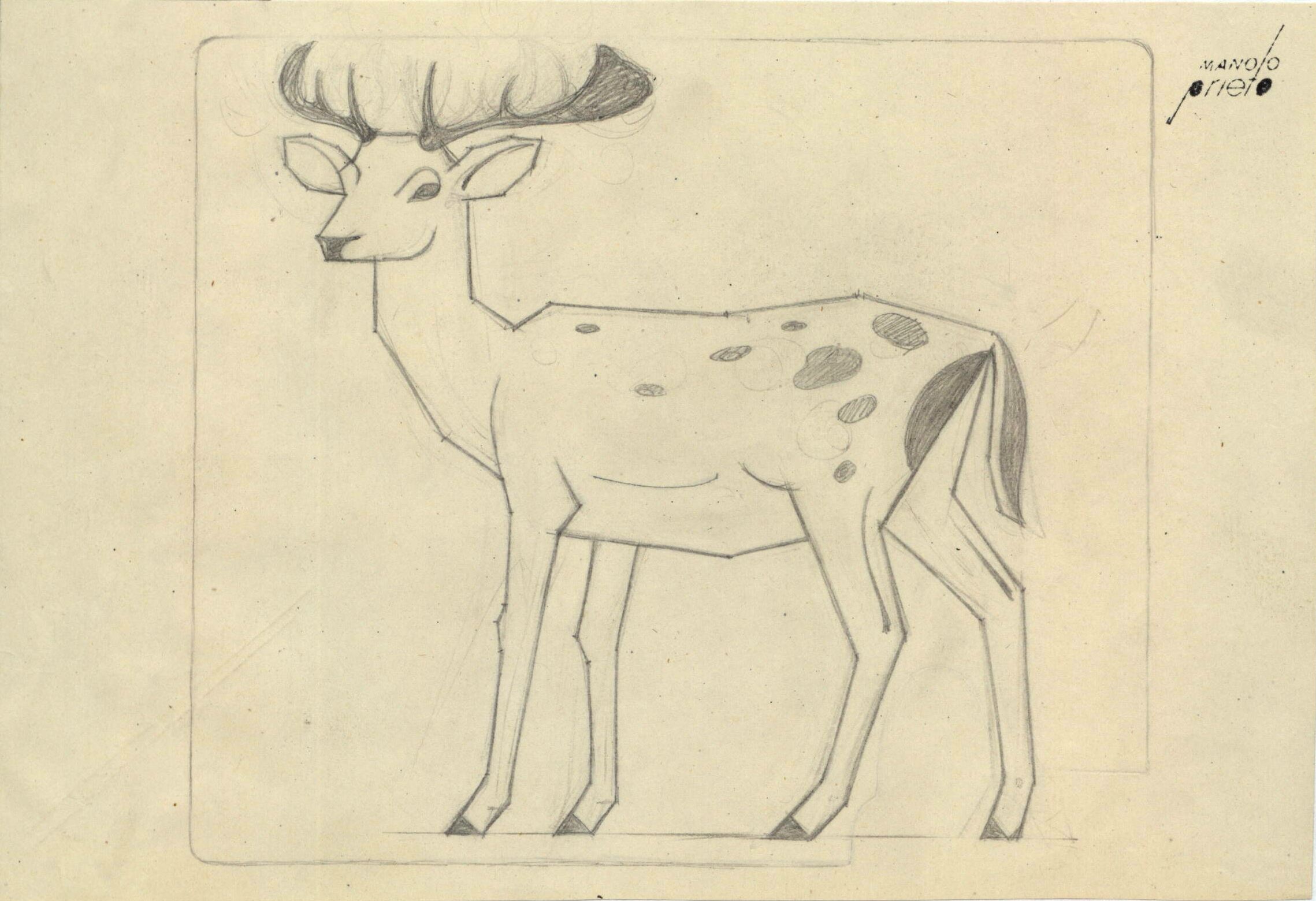 - Enmarcado en este dibujo firmado en su parte superior se destaca la imagen de un ciervo con grandes astas y con manchas grises por su cuerpo, que se encuentra de perfil y su cabeza de frente. Destacan las líneas grises sobre un fondo claro.