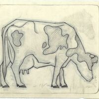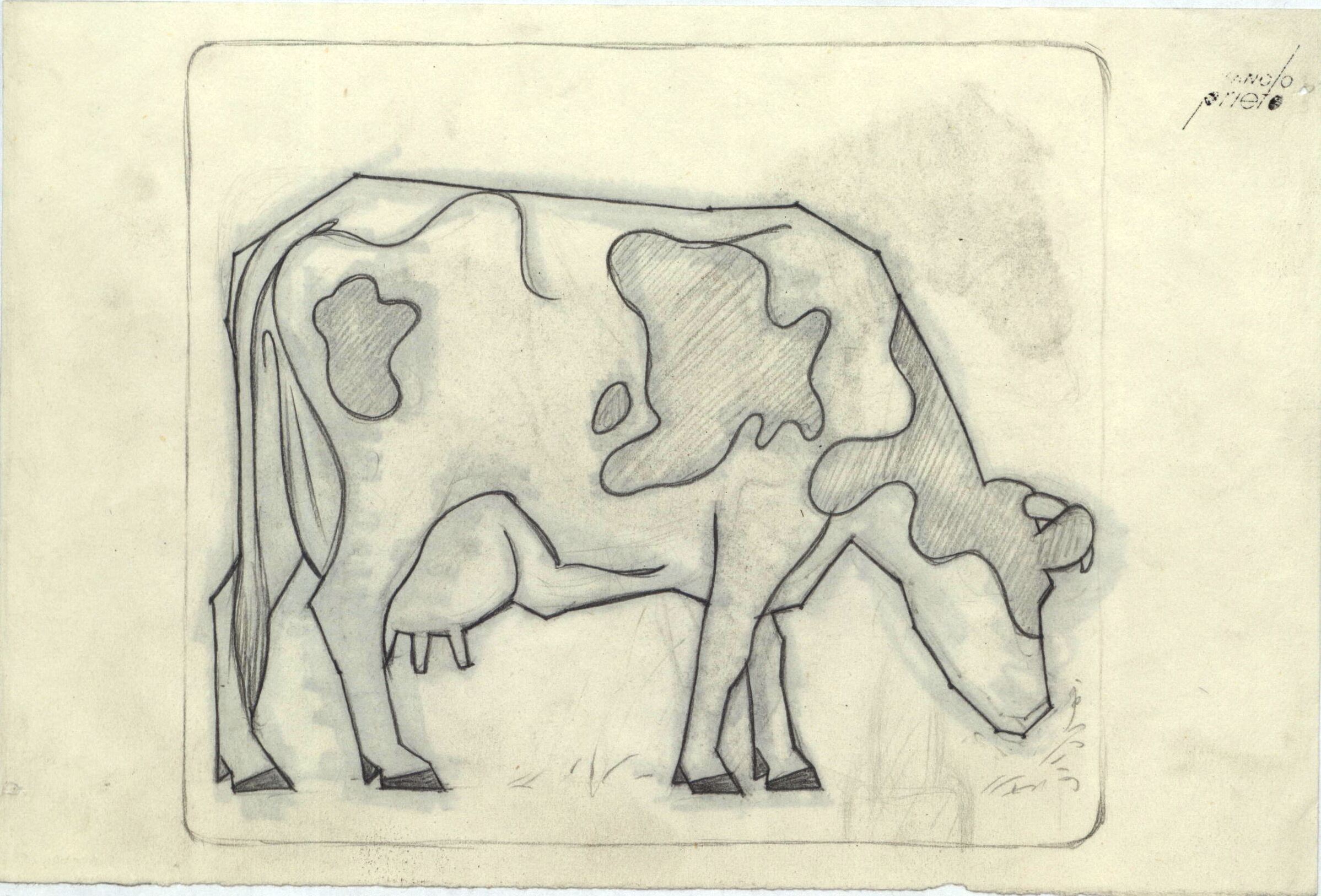 - En este dibujo ligeramente enmarcado se ve la figura de una vaca blanca con manchas grises agachada su cabeza como si estuviese comiendo. La figura del animal está de perfil. Se puede apreciar la firma del pintor en la parte superior de la izquierda, en una esquina.
