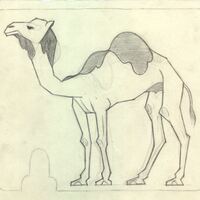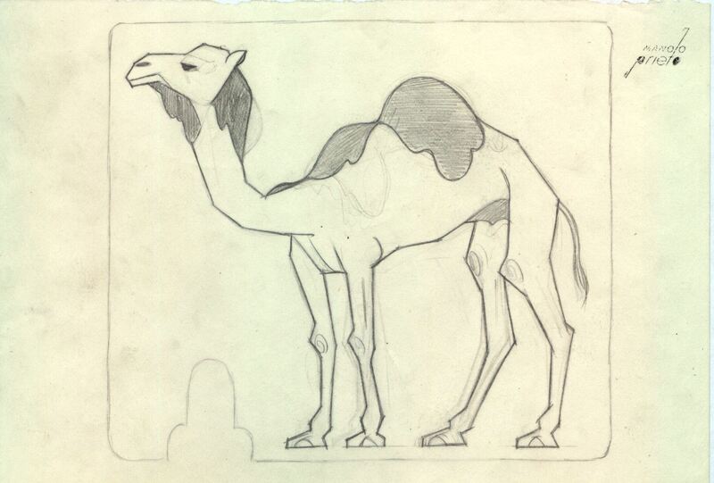 - Sobre un fondo claro y enmarcado destaca el dibujo de un camello de perfil, blanco y en su joroba con manchas grises. Se puede apreciar la firma del artista en la parte superior de la izquierda, en una esquina.