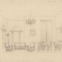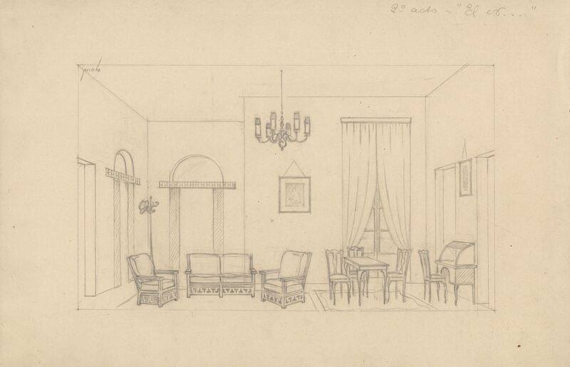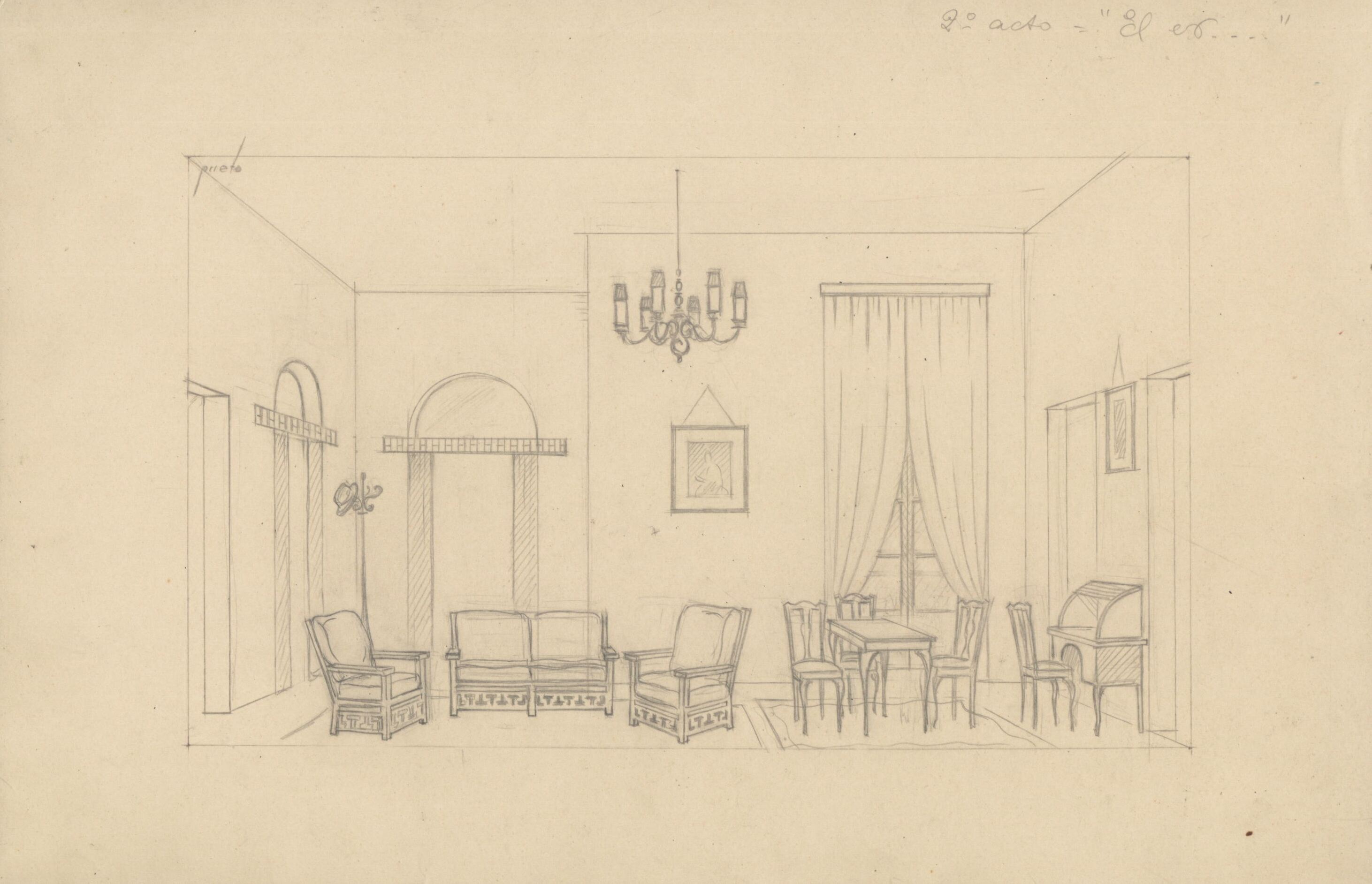 - Dibujo de líneas muy limpias, a lápiz de un escenario teatral, que recrea el ambiente de un salón señorial, sabemos que pertenece a un escenario porque arriba del dibujo se puede leer 1 acto…