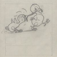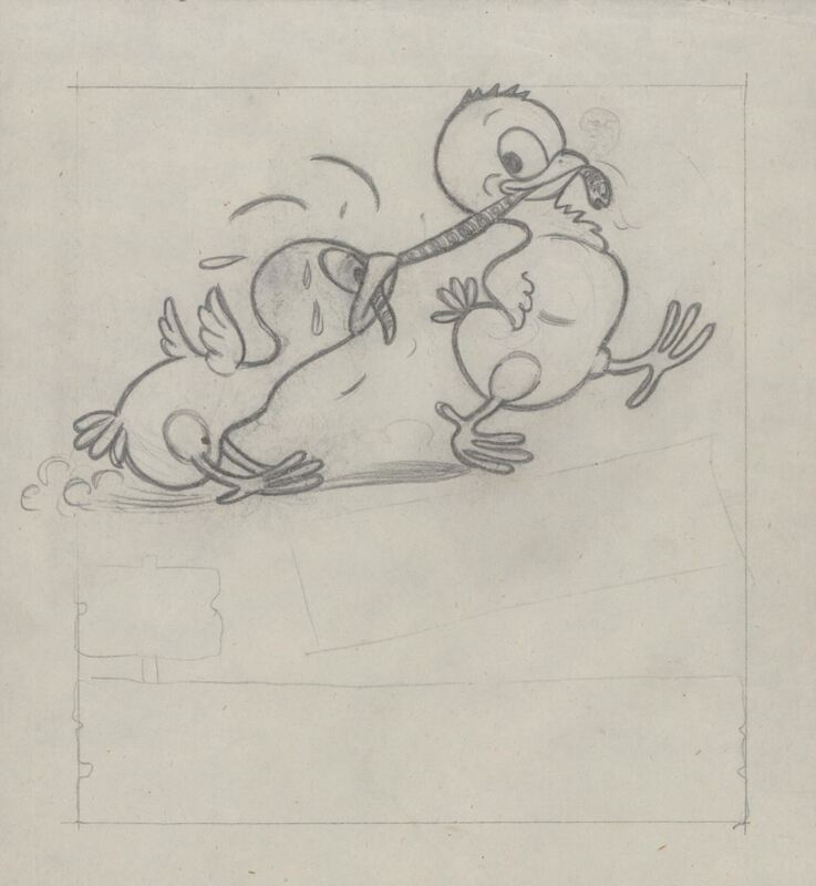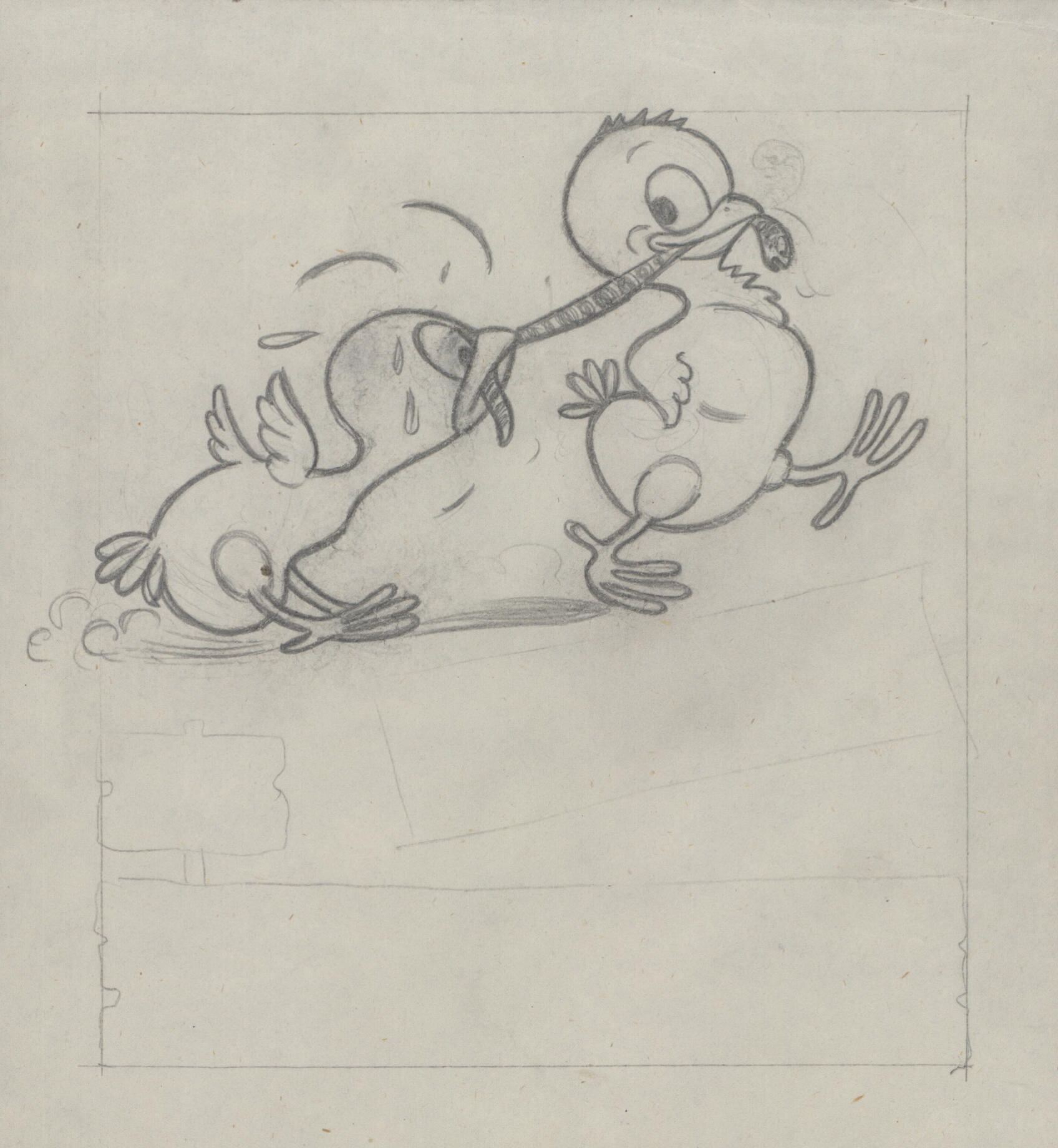 - Dibujo a lápiz de dos jóvenes poyuelos jugando con una lombriz que llevan en sus picos, uno de ellos corre tirando como si quisiera quitárselo mientras que el otro poyuelo lucha por mantener en su pico la lombriz.